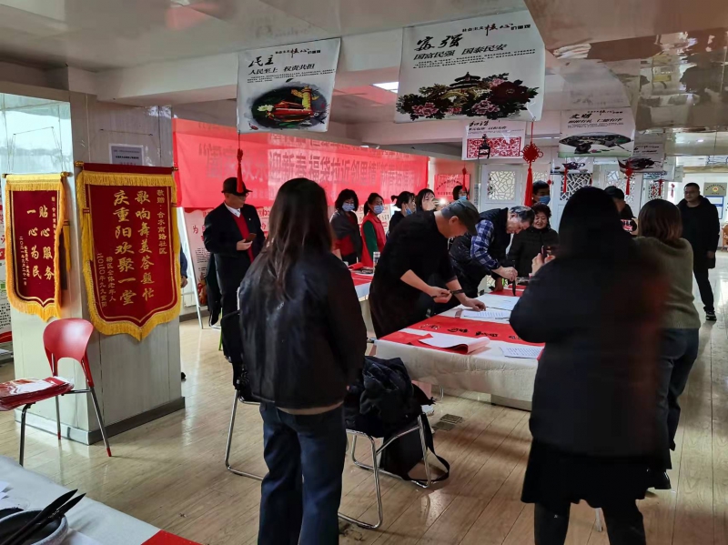 四季青街道合水南路社區大廳內,伴隨著喜氣洋洋的音樂,書法愛好者們不拘一格、揮毫潑墨,寫下一幅幅新春的寄語。